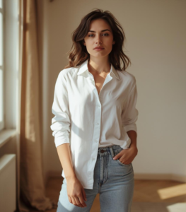 A classic white button-down is one of the most timeless wardrobe staples. It works for both casual outfits and polished office looks.
