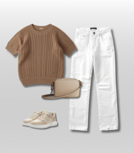 Lightweight sweater + white jeans + sneakers + crossbody bag
