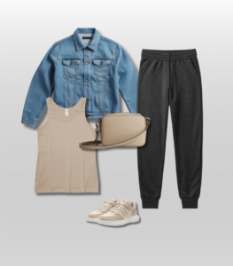 Neutral tank + joggers + denim jacket + sneakers + crossbody bag