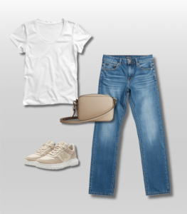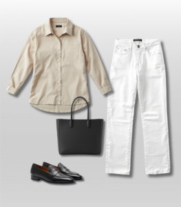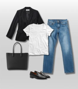 White t-shirt + straight-leg jeans + blazer + loafers + structured tote