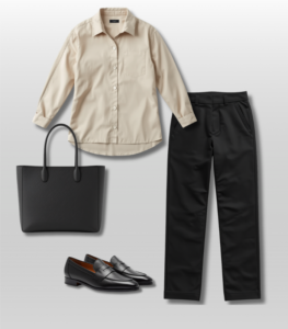 Button-down shirt + tailored trousers + loafers + structured tote