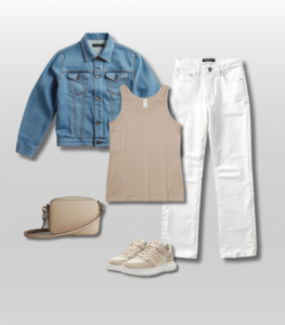 Neutral tank + white jeans + denim jacket + sneakers + crossbody bag