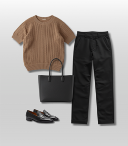 Lightweight sweater + tailored trousers + loafers + structured tote