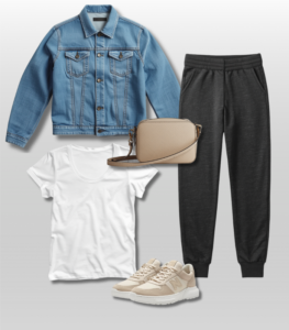 White t-shirt + joggers + denim jacket + sneakers + crossbody bag