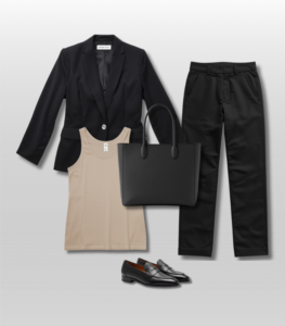 Neutral tank + tailored trousers + blazer + loafers + structured tote